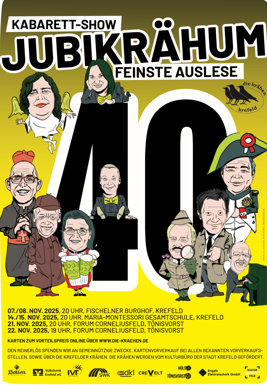 wir feiern 40 Jahre DIE KRÄHEN in Krefeld! Unser Jubiläumsjahr ist voller Highlights und im Februar mit einem eigenen Karnevalswagen im Krähen-Outfit gestartet. Im Juni folgte der Kabarettehrenpreis KREFELDER KRÄHE an Christian Ehring im ausverkauften Theater Krefeld.
